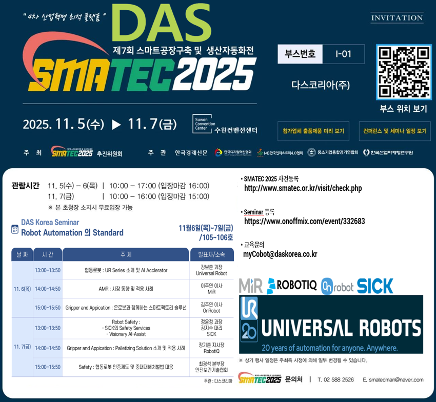 다스코리아에서는 11월 수원컨벤션센터에서 개최되는 SMATEC2025에 다시 한 번 참가하게 되었으며, 고객 여러분을 위해 별도의 Seminar 자리를 마련하였습니다.